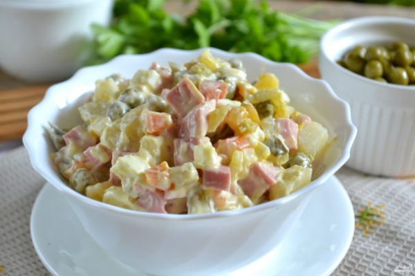 Салат "Оливье" очень простой в приготовлении, и каждая хозяйка сможет побаловать своих родных и гостей этим вкусным и сытным блюдом. Залогом успеха в приготовлении салата являются правильно подобранные ингредиенты. Вареная колбаса должна быть свежей и качественной. Ее цена не должна быть ниже цены мяса. Берите докторскую или молочную "варёнку". Горошек берите мозговых сортов. Он более нежный и сладкий. Майонез также выбирайте жирный, так как этот соус делается из подсолнечного масла и желтков, и он не может иметь низкую жирность. Или, как вариант, сделайте майонез сами. Теперь я вам подробно расскажу, как приготовить салат "Оливье" классический с колбасой по моему рецепту. Вам понадобится немного времени и усилий — и этот салат украсит ваш стол.